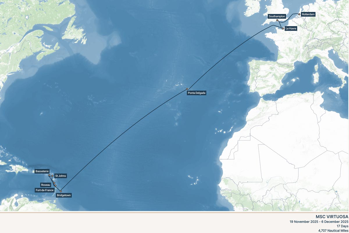 In november en december hebben we een repositioning cruise gemaakt met vertrek uit Rotterdam. Repositioning cruises zijn cruises waarbij de cruise schepen over de aardbol worden verplaatst in verband met de wisseling van zomer- naar winterseizoen, of omgekeerd. Wij hebben de trans-Atlantische oversteek gemaakt vanuit Europa naar het Caribisch gebied.