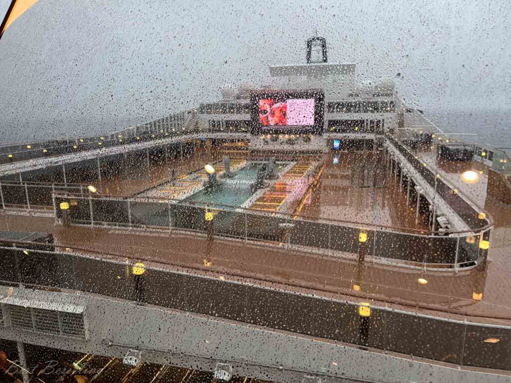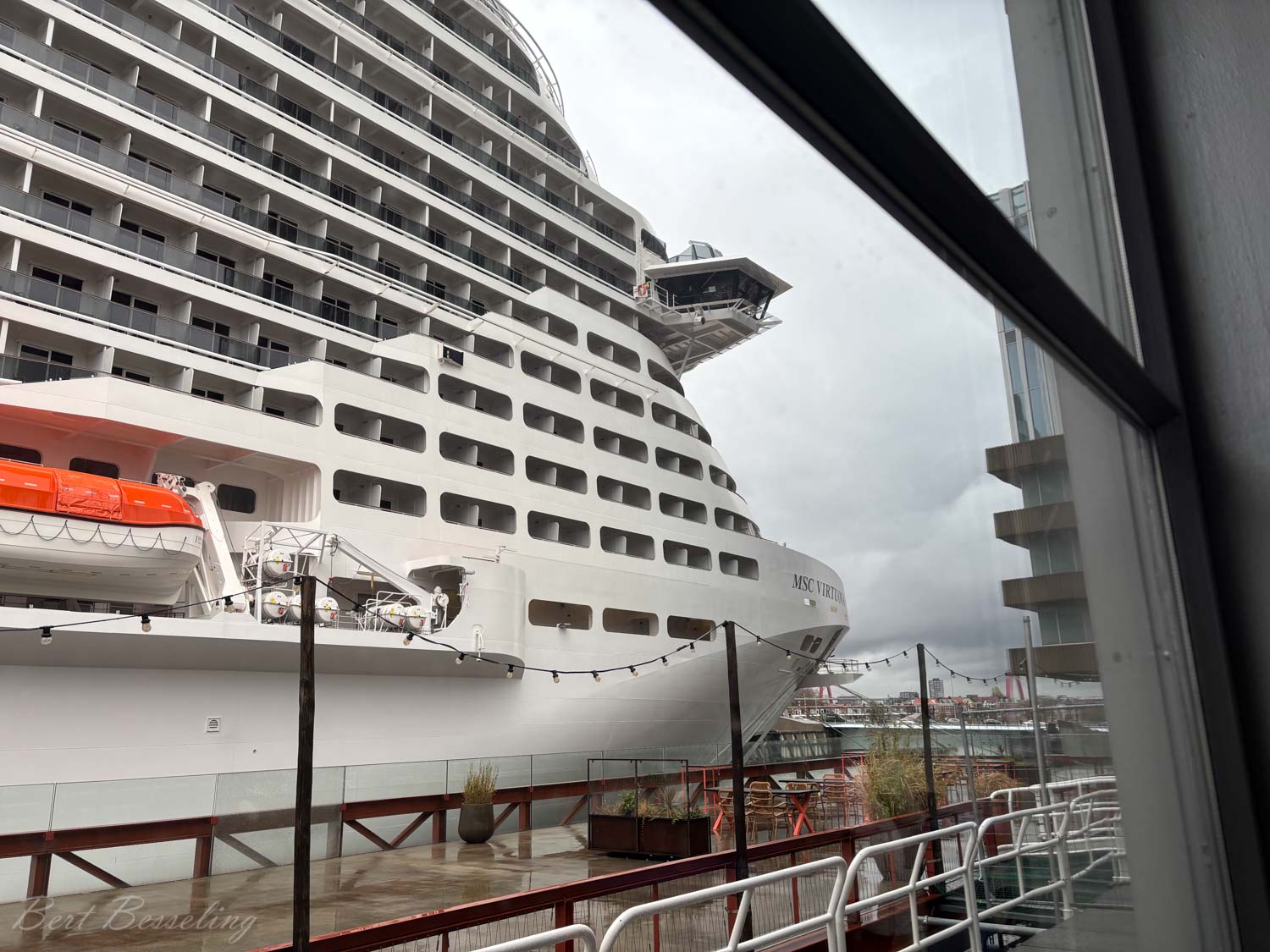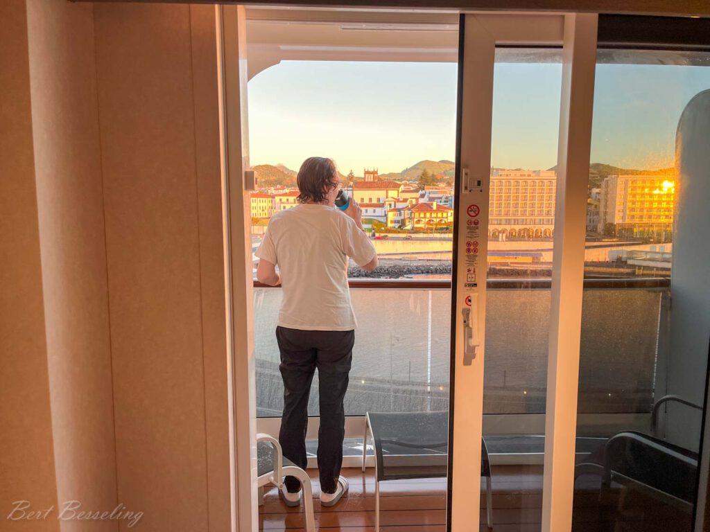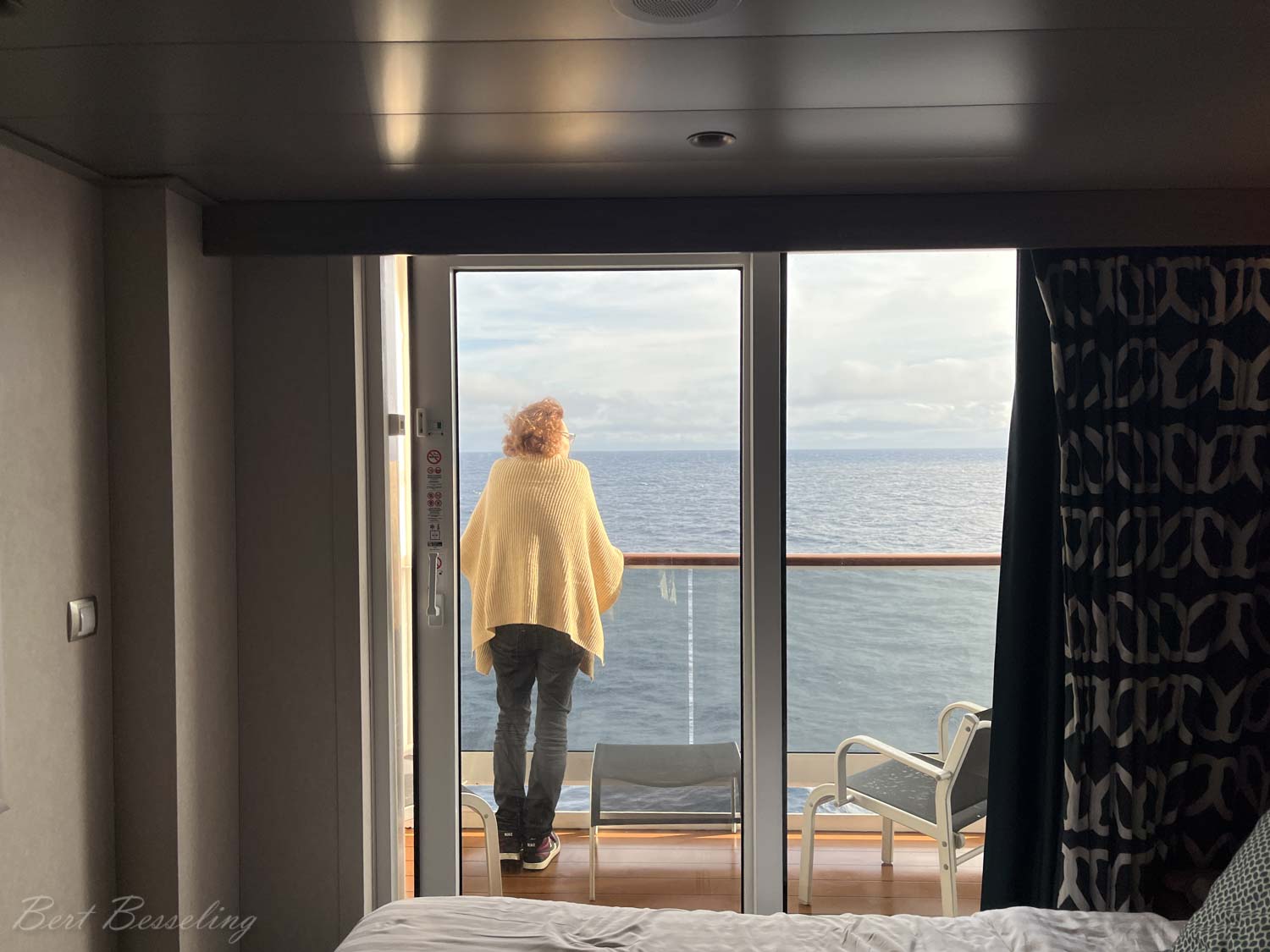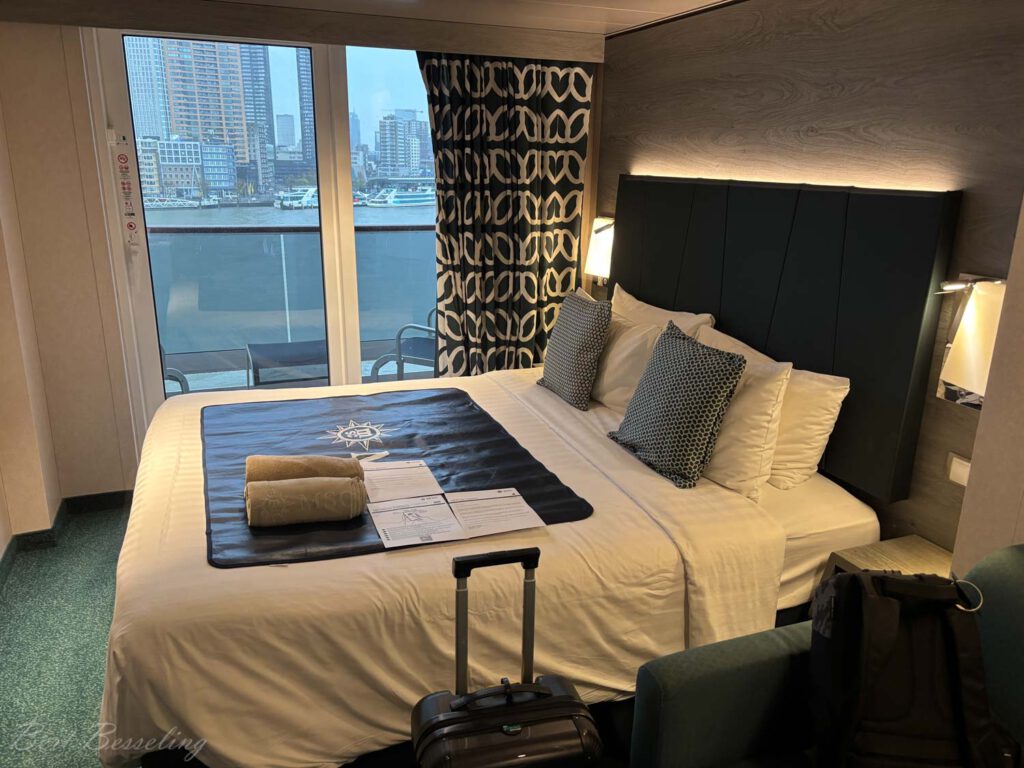 Eindelijk konden we aan boord en naar onze hut. Dit keer hebben we een balkonhut op deck 9. Hopelijk kunnen we met de verwachte stijgende temperaturen ook op het balkon zitten. In Rotterdam regende het de hele tijd en was het waterkoud met een graad of 4.