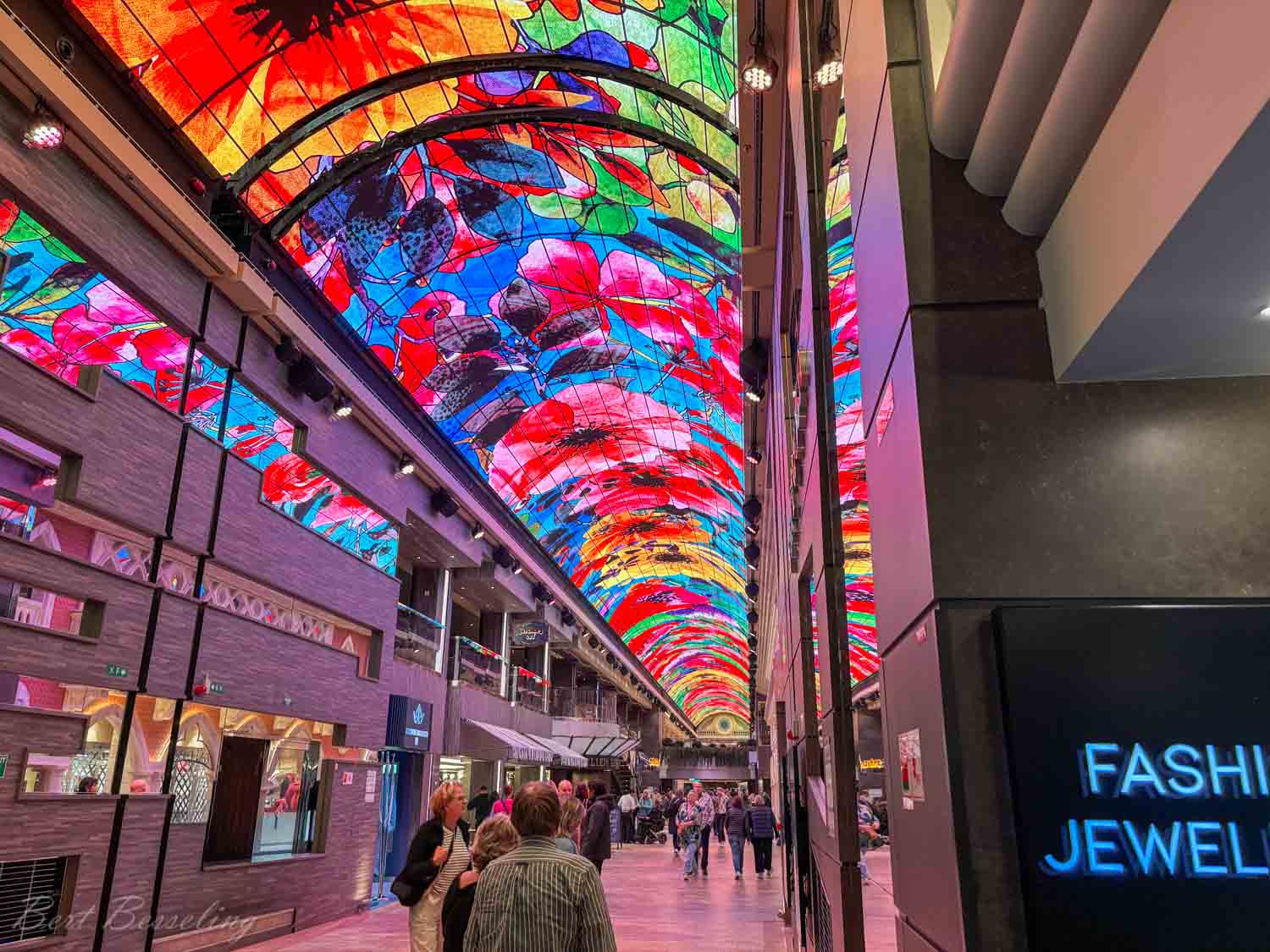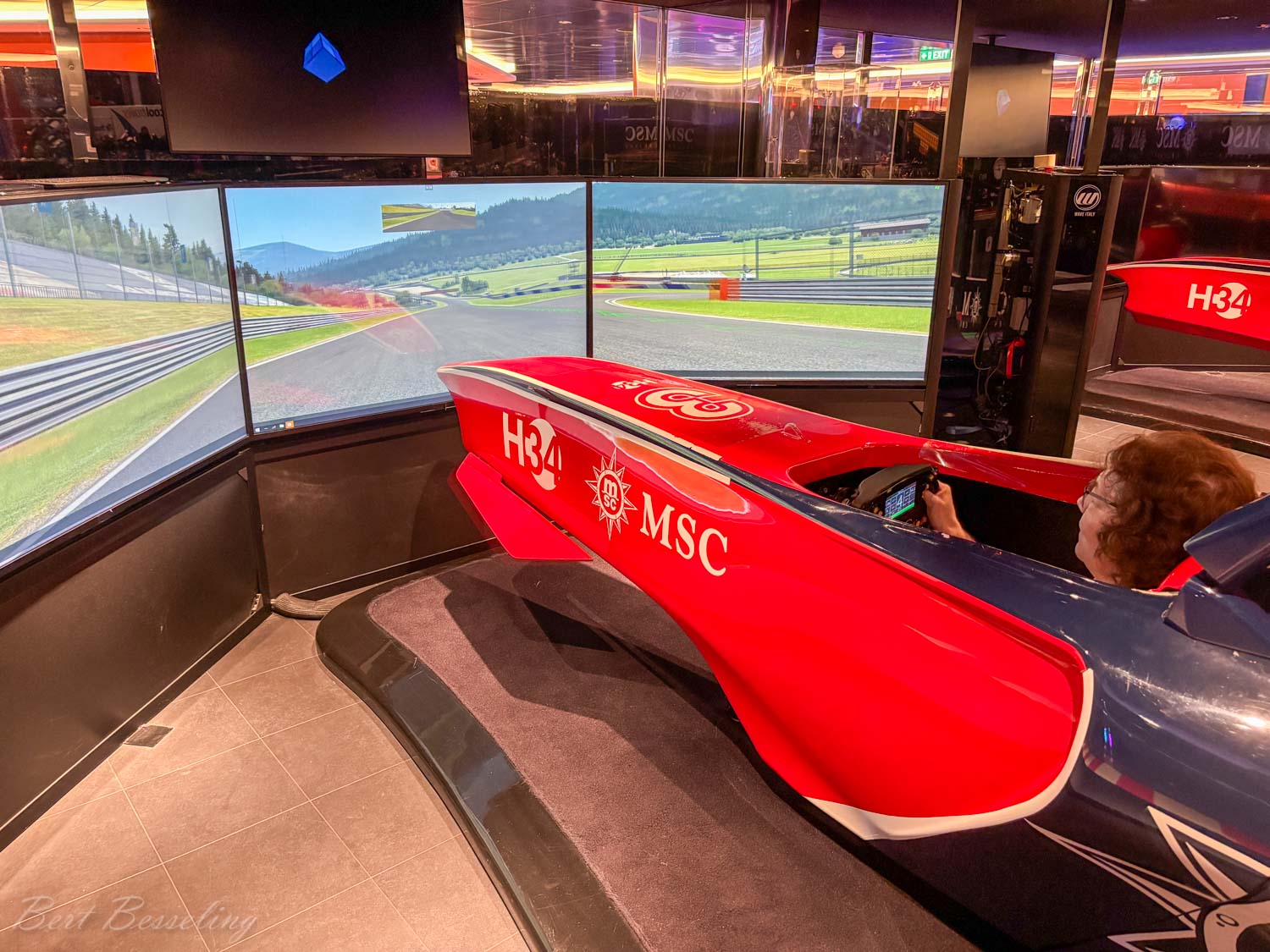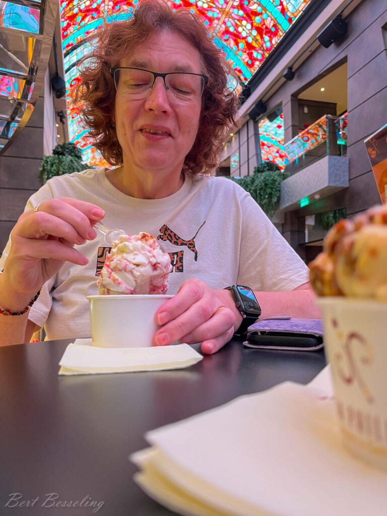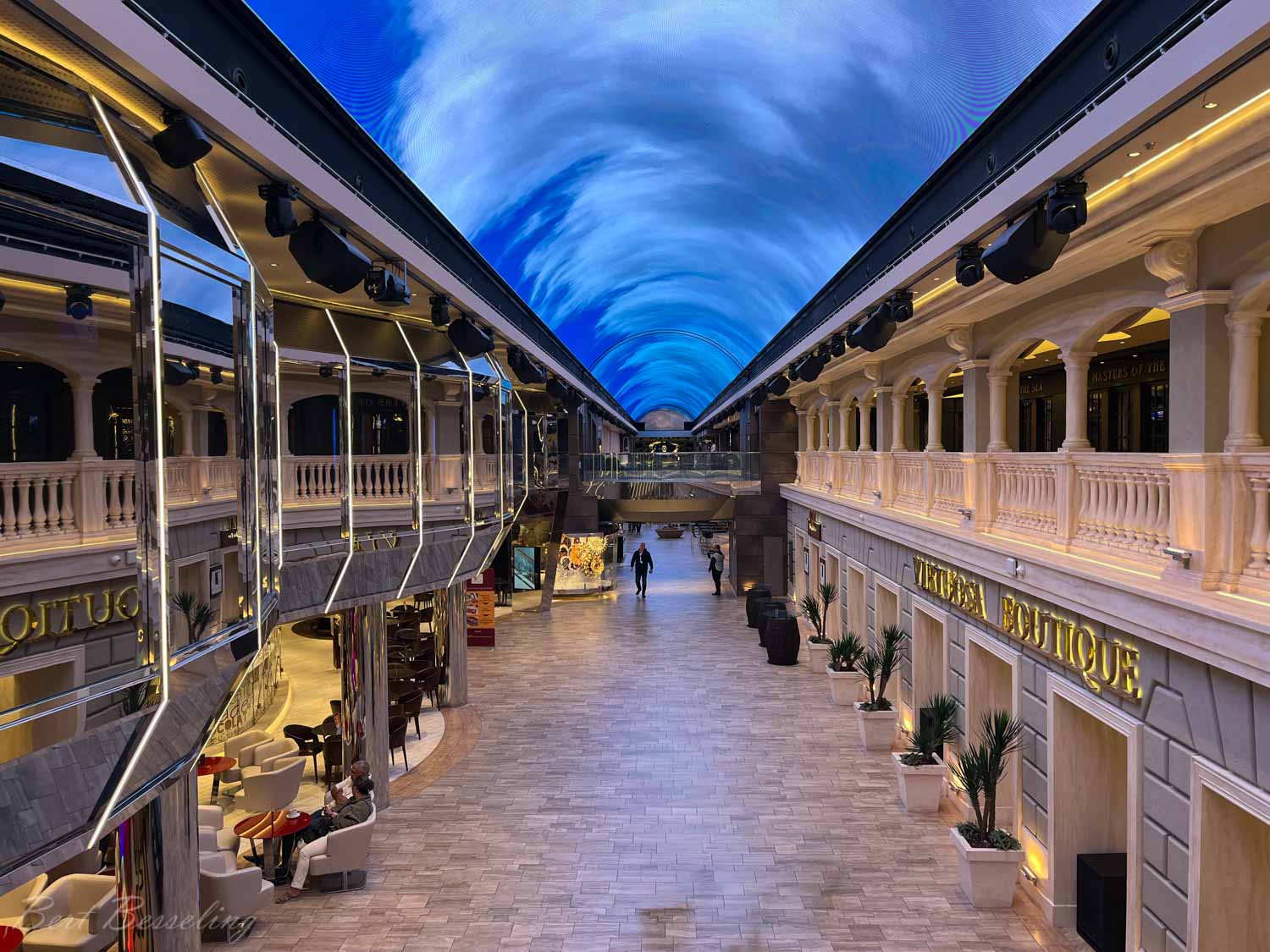 Een rondje op het schip gemaakt en de verplichte veiligheidsinstructie gevolgd. De Virtuosa heeft op deck 6 en 7 een zogenaamde Galleria Virtuosa van ongeveer 90mtr lang met op deck 6 diverse winkeltjes aan weerszijden en op deck 7 diverse cafés en specialiteiten restaurants. Het plafond is een gigantisch ledscherm waar ze plaatjes, video’s of teksten kunnen tonen. Of gewoon een blauwe lucht met wolken alsof je in een winkelstraat bent.