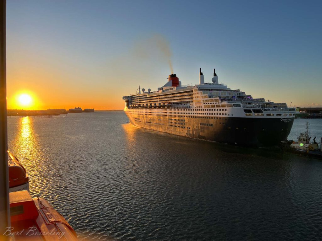 Tegen 8uur in de ochtend kwamen we bij de cruise terminal van Southampton aan. Het was schitterend weer maar wel koud. De Queen Mary 2 vertrok net toen wij hadden aangemeerd. Meteen om 8uur was de verplichte immigratie controle aan boord van de Engelse douane. Daarna rustig aangedaan en in de loop van de ochtend aan wal gegaan naar het winkelcentrum van Southampton. Hier en daar was de Kerstsfeer al goed aanwezig.