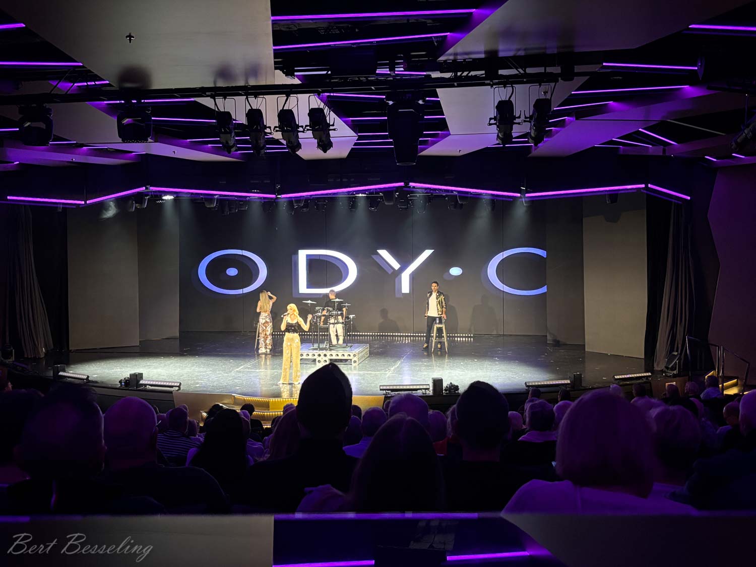 Aan het begin van de avond naar het theater geweest voor een optreden van de groep ODY-C. Een jonge vocale groep zangers met een drumstel zongen bekende nummers.