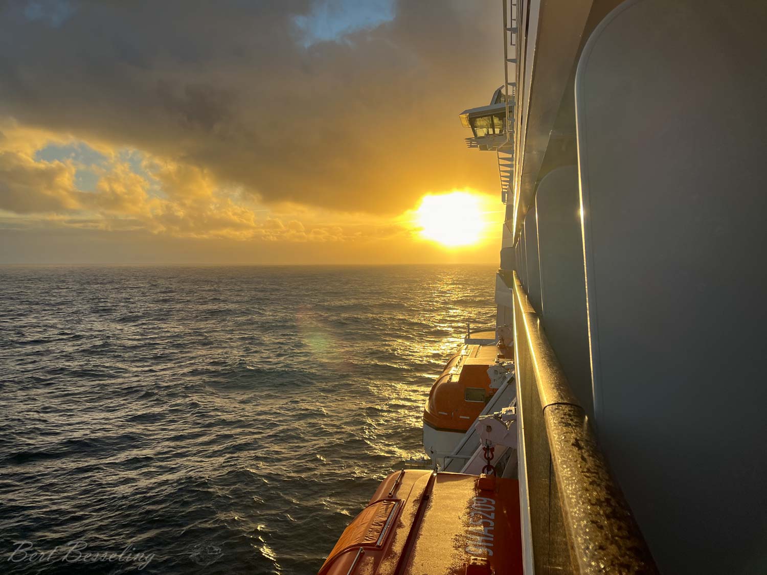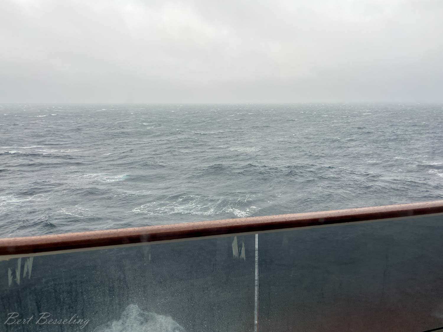 De tweede zeedag was wederom bewolkt maar nu ook met wat regen. De zee oogt nu wat rustiger dan gisteren, toch beweegt het schip wat meer.