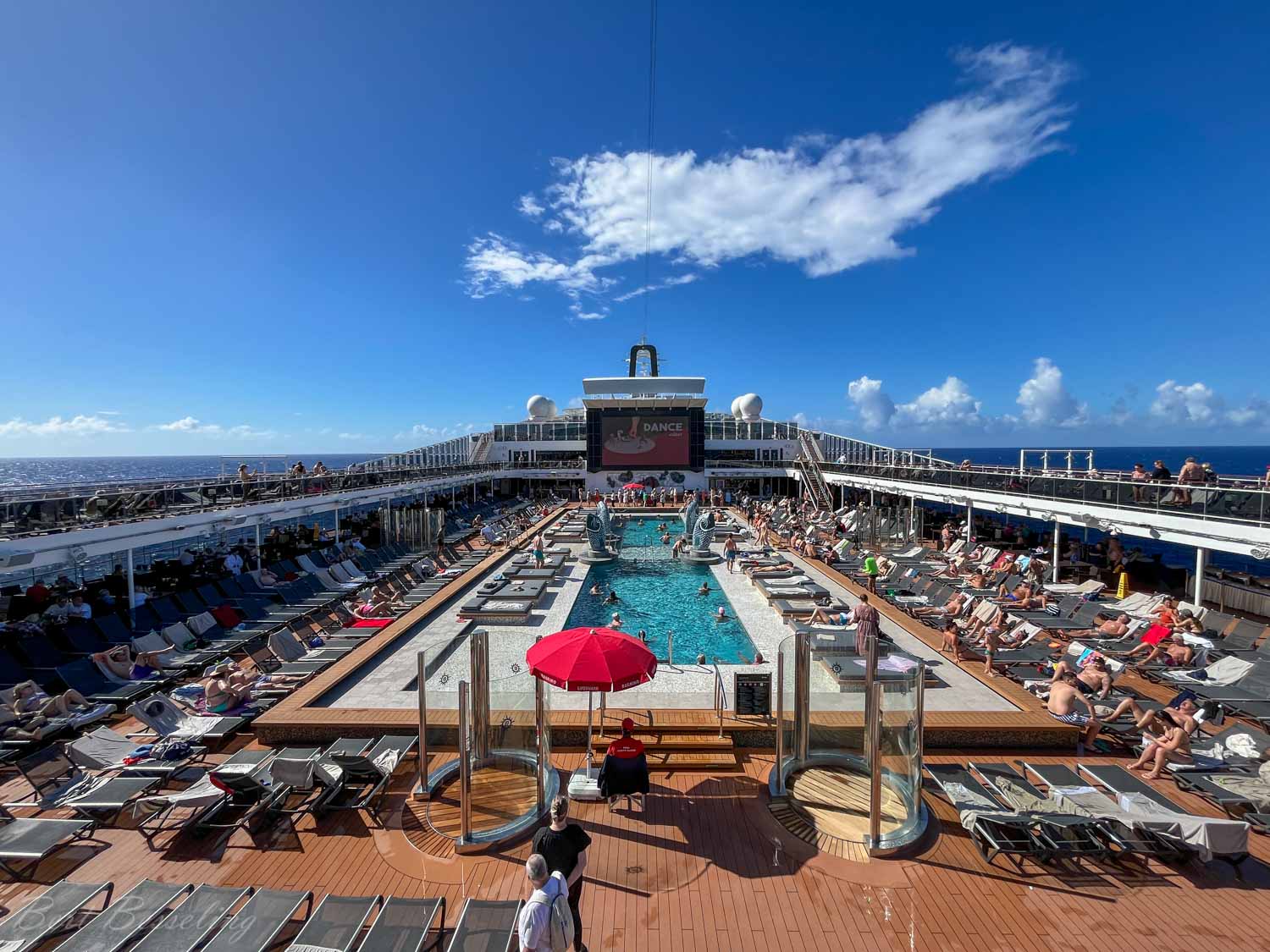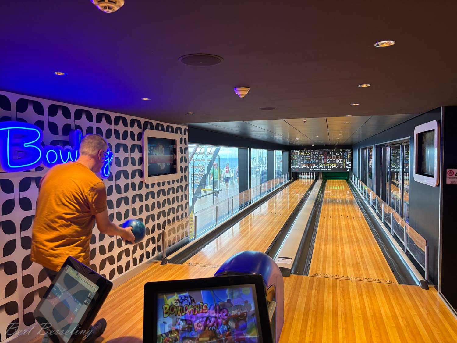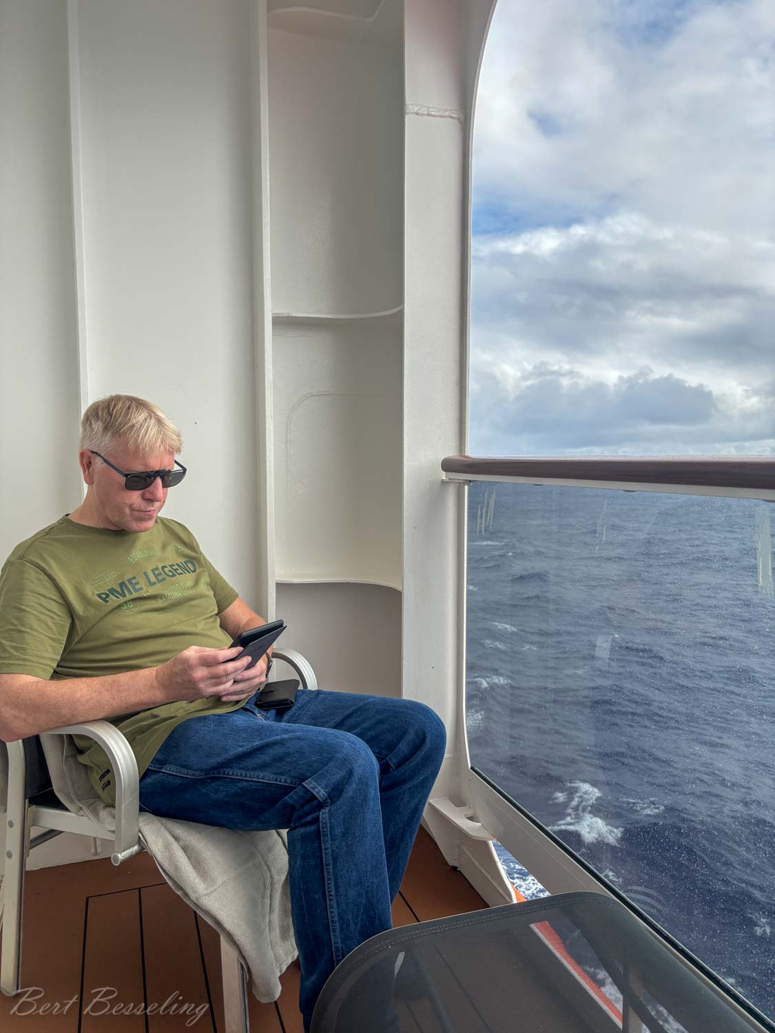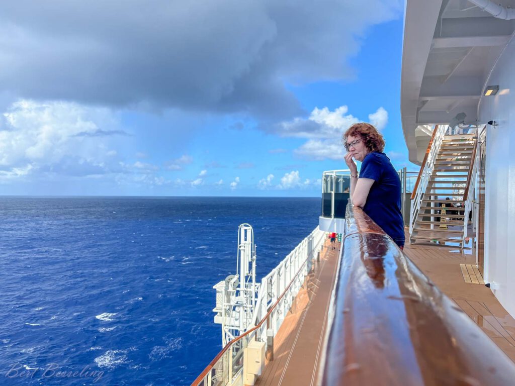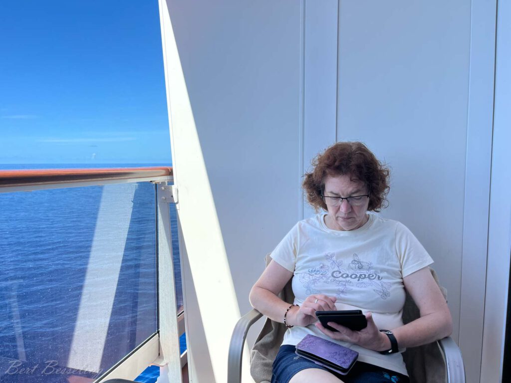 Lekker rustig aan gedaan. Wezen bowlen, lezen , optredens in het theater bezocht, lezingen over Antigua en Dominica bijgewoond. Verder regelmatig op het balkon gezeten, maar je merkt dat de zon al steeds meer brandt. Bert heeft nog een “backstage” tour gedaan. Een rondleiding en uitleg over het schip waar je nooit komt, zoals achter de coulissen van het theater, de keuken, de voorraad kamer en wasserette. Een keertje naar de sportschool geweest en de nodige rondjes op de “Power walking track” gelopen.