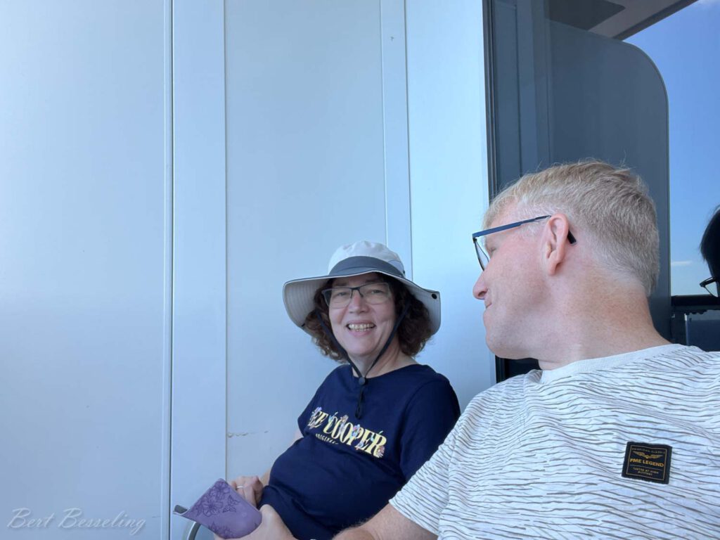 Bij het eindpunt van de trein weer in de bussen gestapt voor de korte terugtocht naar het schip. Echter onze bus bleek pech te hebben. We werden verdeeld over de andere bussen, maar aangezien er al een bussen weg waren, kwamen ze bussen te kort. Bert kon nog met een bus mee en Eveline met 2 anderen in een privé auto. Moest eerst nog wel enkele ondefinieerbare items uit de auto verwijderd worden.