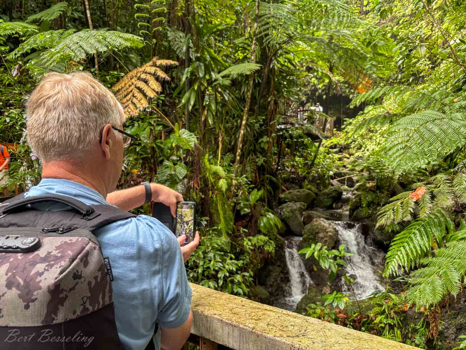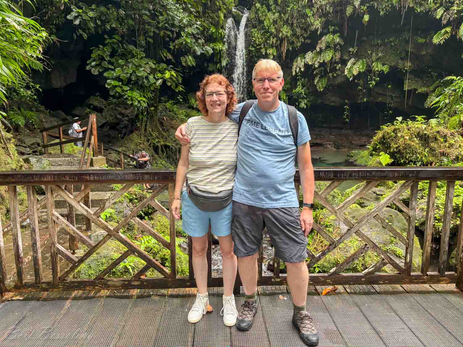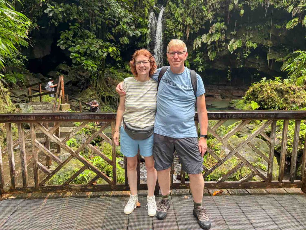 Het was weer om 8.20uur verzamelen in het theater en in kleine groepjes gingen we met bussen op weg. Dominica is duidelijk anders dan de andere eilanden die we tot nog toe hadden gezien. Het eiland heeft hoge bergen en deze zorgen ook voor een regenachtig klimaat met de daarbij behorende tropische regenwouden. De eerste stop Emerald Pool in de bergen van Dominica. We kwamen bij Emerald Pool aan en het had net even geregend. Ze verkochten bij de souvenirshops wel poncho’s, maar tegen beter weten in dachten we dat het de rest van de dag wel droog zou blijven. Na een korte wandeling kwamen we bij Emerald Pool.