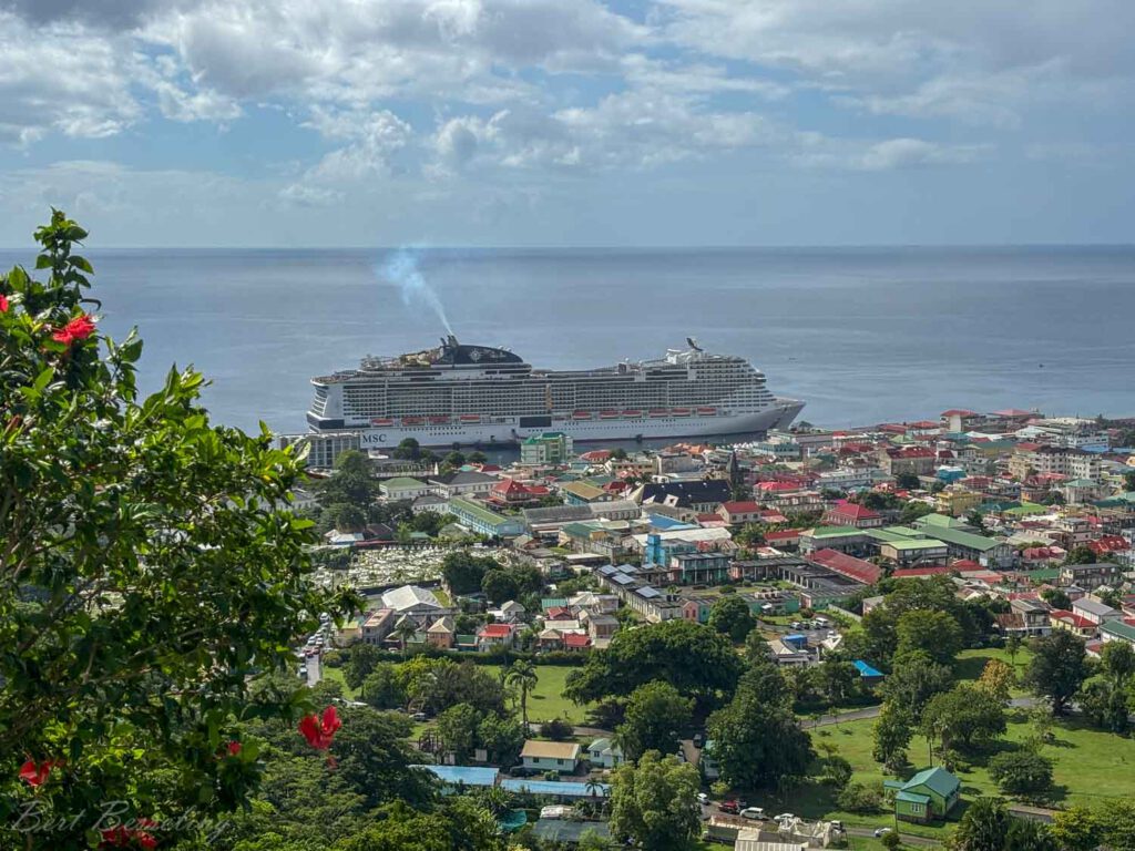 Terug naar de hoofdstad van Dominica, Roseau. In Roseau met de bus door de botanische tuinen gereden, over de begraafplaats (links de Katholieke en rechts de openbare) en nog even gestopt bij een uitzichtpunt.